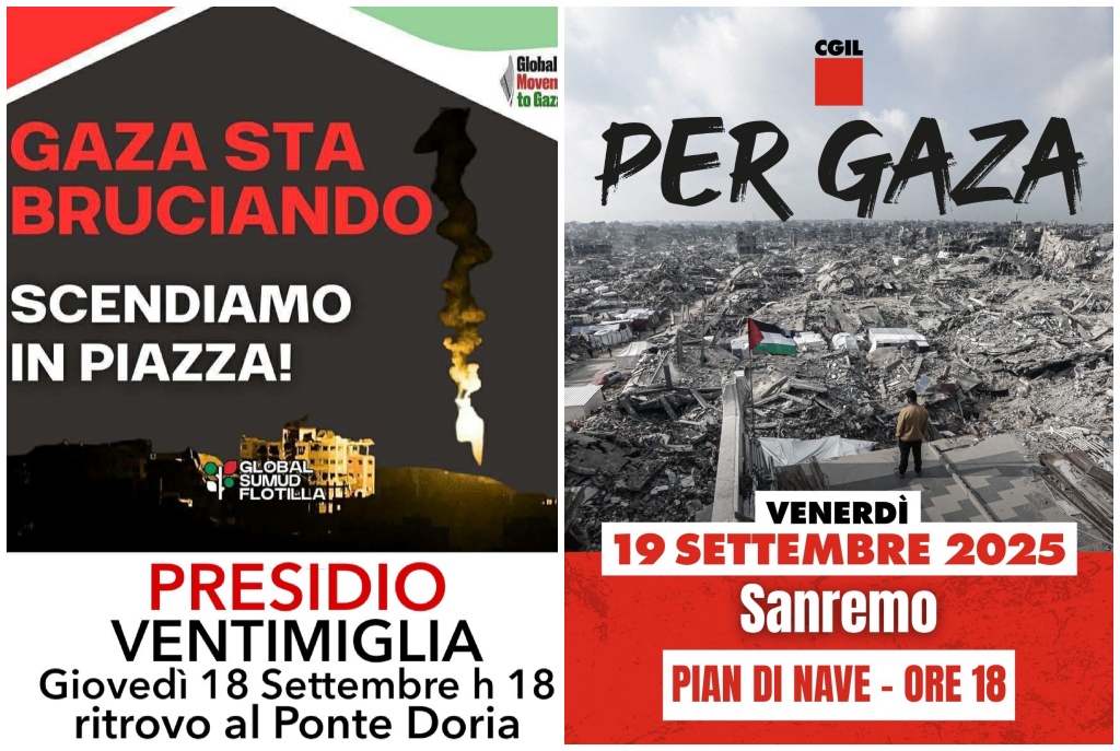 L’incontro di venerdì, organizzato dalla CGIL, si terrà invece a Sanremo, sempre alle ore 18, in Pian di Nave. Quest’ultima mobilitazione si inserisce all’interno di una più ampia giornata nazionale organizzata dalla stessa CGIL per fermare il massacro a Gaza.