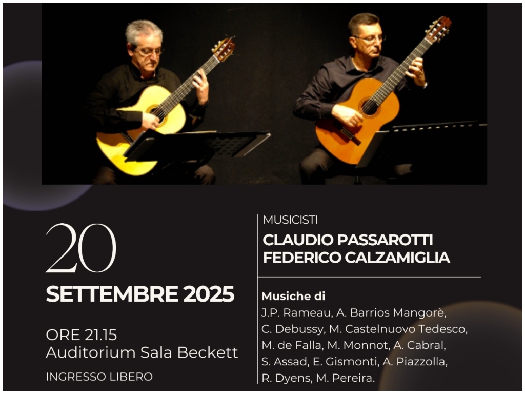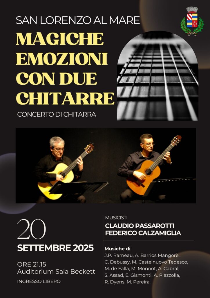 Sabato 20 settembre all’Auditorium Sala Beckett di San Lorenzo al Mare (ore 21,15), andrà in scena “Magiche emozioni con due chitarre“, concerto di chitarra classica con i musicisti Claudio Passarotti e Federico Calzamiglia.