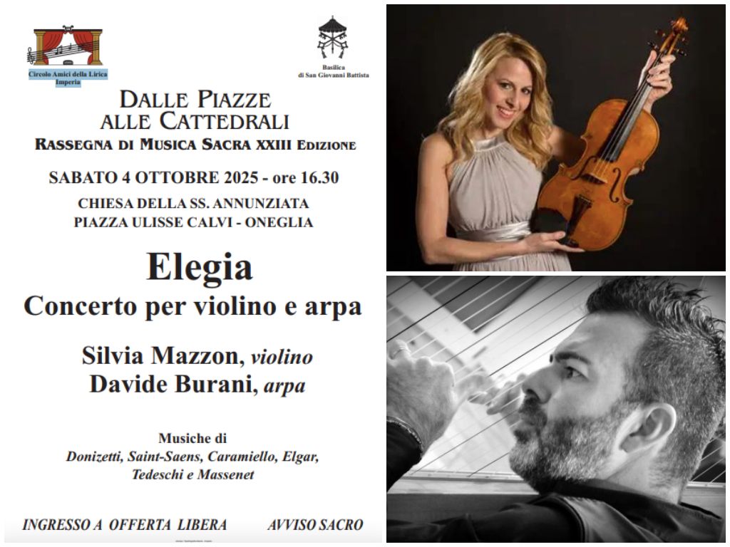 Si terrà sanato 4 ottobre, alle ore 16.30, presso la chiesa della SS Annunziata di Piazza Ulisse Calvi a Imperia, “Elegia” concerto per violino e arpa. Organizzato dal Circolo Amici della Lirica Imperia e dalla Basilica di San Giovanni, rientra nella XXIII edizione della rassegna di musica sacra “Dalle piazze alle Cattedrali”.