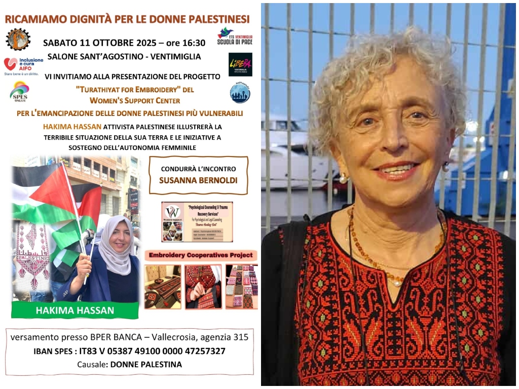 Nel corso dell’evento, condotto da Susanna Bernoldi (attivista imperiese di AIFO in procinto di tornare in Cisgiordania) e organizzato su iniziativa di P.E.N.E.L.O.P.E., SPES ed AIFO Imperia, in collaborazione con Scuola di Pace, Mappamondo e Libera Ventimiglia Presidio Hyso Telharaj, verrà presentato il progetto “Turathiyat for Embroidery”.
