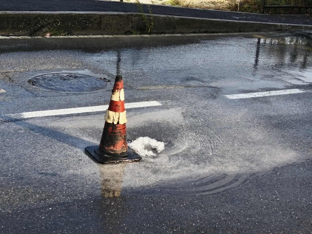 L’acqua fuoriesce copiosamente dall’asfalto, allagando la strada