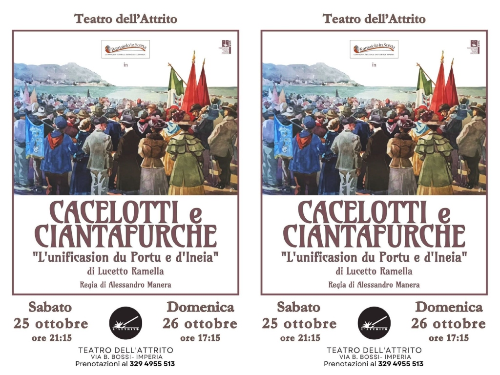 Sabato 25 ottobre alle ore 21.15 e in replica domenica 26 ottobre alle 17.15, al Teatro dell’Attrito, la Compagnia del Ramaiolo porterà in scena lo spettacolo “Cacelotti e Ciantafurche, l’unificasion du Portu e d’Ineia“, commedia dialettale scritta da Lucetto Ramella che racconta in tema ironico e popolare la nascita della città di Imperia.