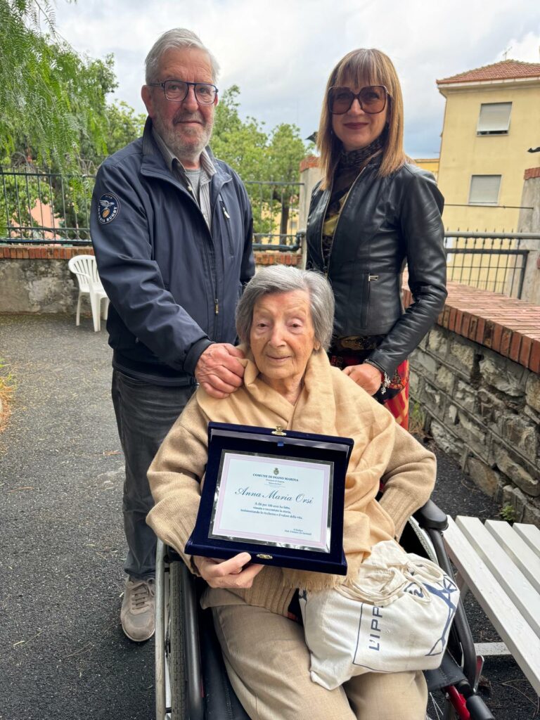 In occasione di questo importante traguardo, il Comune di Diano Marina ha voluto consegnarle una targa commemorativa, come segno di affetto e riconoscenza da parte di tutta la cittadinanza. Alla consegna della targa – con il Sindaco e l’Assessore Sabrina Messico – era presente anche il figlio Stefano.