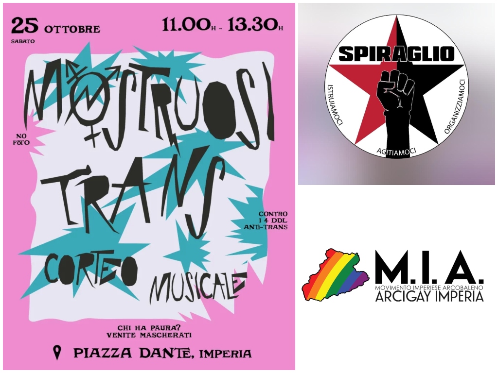 M.I.A. Arcigay Imperia ha annunciato la propria adesione alla manifestazione di domani, sabato 25 ottobre, in Piazza Dante a Imperia, organizzata da Spiraglio Imperiese, in difesa delle persone transgender e contro i recenti disegni di legge che minacciano i diritti e la libertà di espressione nelle scuole e nella società.