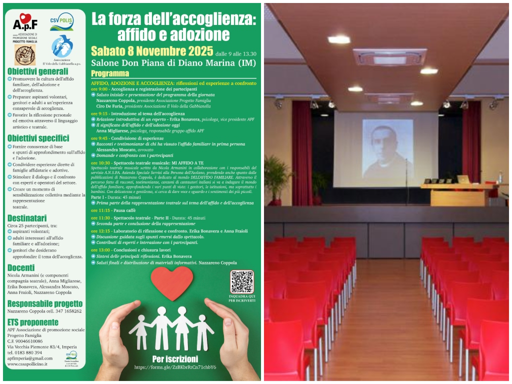 Promuovere la cultura dell’accoglienza e dell’affido familiare, valorizzando il significato profondo del prendersi cura. È questo l’obiettivo dell’incontro “La forza dell’accoglienza: affido e adozione”, organizzato da A.P.F. – Associazione di Promozione Sociale Progetto Famiglia, in collaborazione con CSV Polis e Il Volo della Gabbianella, in programma sabato 8 novembre a Diano Marina, presso il Salone Don Piana.