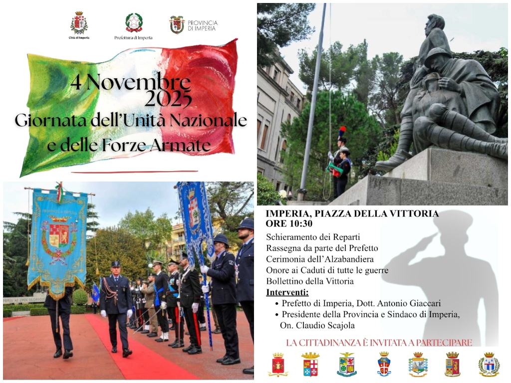 Il prossimo martedì 4 novembre si terrà a Imperia in Piazza della Vittoria, la cerimonia istituzionale di questa Provincia in occasione della “Giornata dell’Unità Nazionale e delle Forze Armate”. L’evento vedrà la partecipazione delle Autorità militari, civili e religiose, delle rappresentanze scolastiche e della cittadinanza. Nel corso della cerimonia sarà ricordato il significato profondo di questa ricorrenza, che rievoca il sacrificio dei caduti della Prima Guerra Mondiale e celebra l’Unità del nostro Paese, fondata sulla coesione del popolo e sull’affermazione dei valori di giustizia, libertà e pace. Un omaggio alle Forze Armate, ieri come oggi presidio di democrazia, sicurezza e legalità, con un sentito ringraziamento per il loro costante impegno al servizio della Nazione.