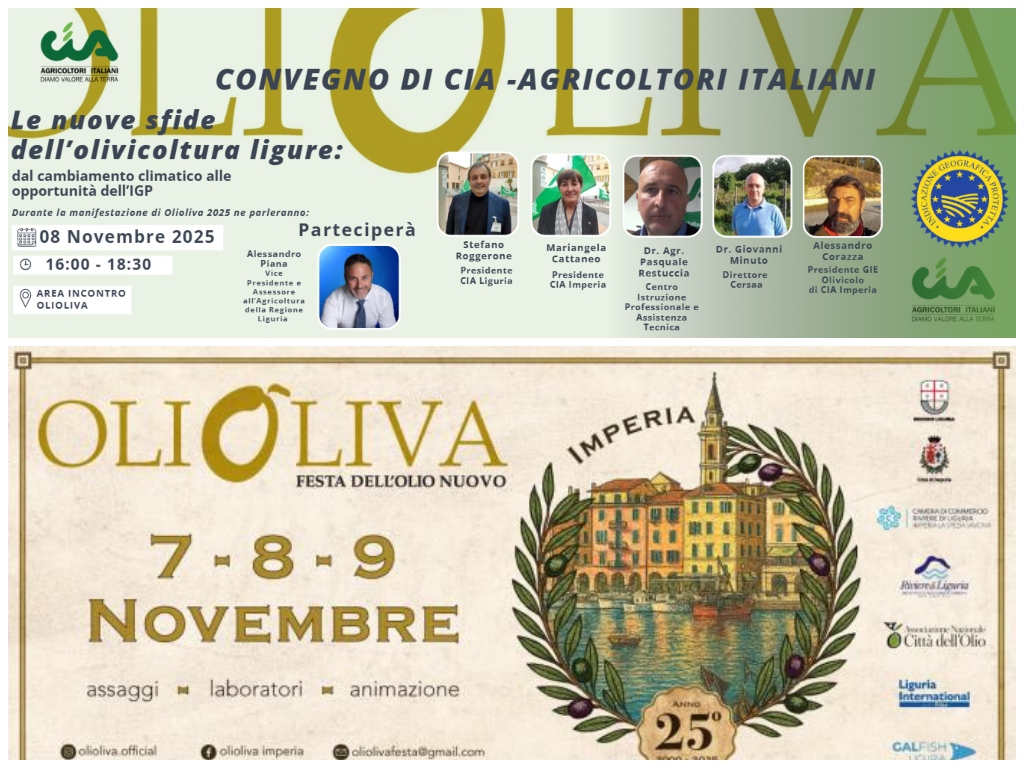 “Le nuove sfide dell’olivicoltura ligure: dal cambiamento climatico alle opportunità dell’IGP“. Questo il titolo del convegno organizzato dalla Cia, la Confederazione italiana agricoltori di Imperia, nell’ambito di Olioliva. L’appuntamento è presso l’Area Incontri di Olioliva sabato 8 novembre 2025 dalle 16.00 alle 18.00.