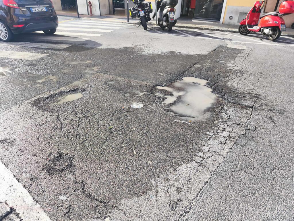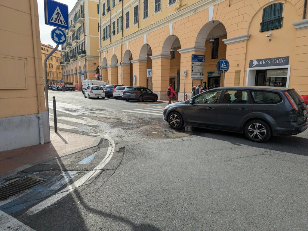 Una perdita d’acqua proprio nei pressi dell’attraversamento pedonale tra la pensilina del bus di largo Nanollo Piana e piazza Dante a Imperia Oneglia. Non proprio il biglietto da visita ideale alla vigilia di Olioliva, la manifestazione autunnale che richiamerà in città migliaia di visitatori.