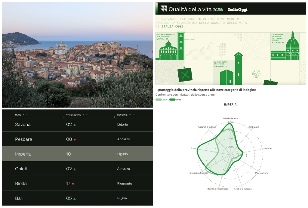 La provincia di Imperia migliora il suo posizionamento nazionale sulla qualità della vita, conquistando il 63° posto con un balzo di dieci posizioni rispetto al 2024. Il dato emerge dall’indagine annuale realizzata da ItaliaOggi e Ital Communications insieme all’Università La Sapienza di Roma, che ha analizzato tutte le 107 province italiane attraverso 92 indicatori.