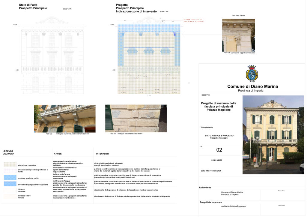 La Giunta Comunale di Diano Marina, riunita lo scorso 19 novembre, ha approvato in linea tecnica ed economica il progetto esecutivo redatto dall’Arch. Cristina Buglione per il restauro della facciata di Palazzo Maglione.