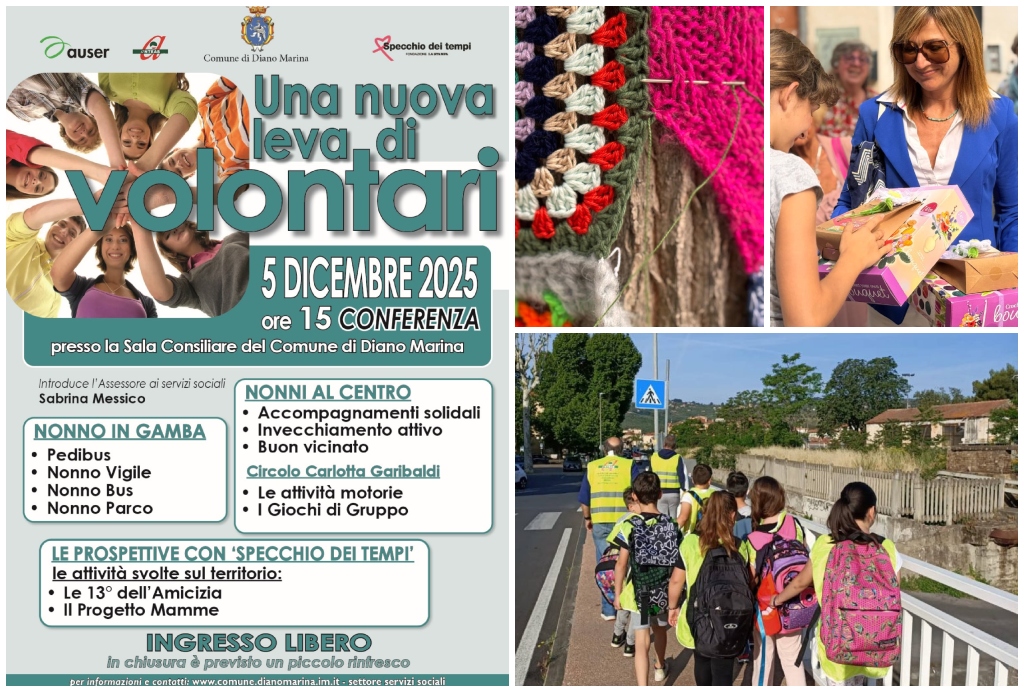 Il Comune di Diano Marina, in collaborazione con le associazioni Auser e Anteas e con il sostegno della fondazione “Specchio dei Tempi”, è lieto di annunciare l’evento “Una nuova leva di volontari“. L’iniziativa si terrà venerdì 5 dicembre 2025 alle ore 15:00 presso la Sala Consiliare del Comune e mira a rafforzare la rete di volontariato locale, fondamentale per il tessuto sociale della città.