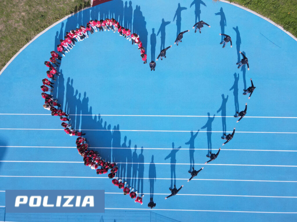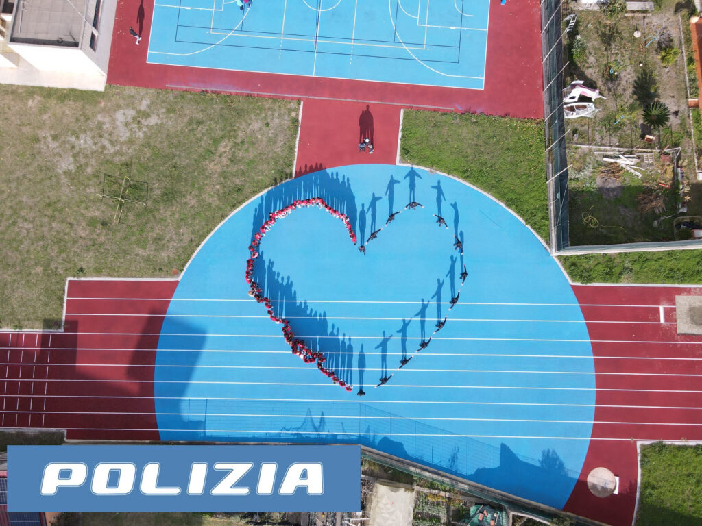 Sul campetto sportivo della scuola, è stato riprodotto un “cuore umano” per metà costituito dagli alunni indossanti una maglietta rossa, simbolo delle ferite spesso invisibili e della schiavitù affettiva, e per l’altra metà dal personale della Polizia di Stato in divisa a significare che un cuore oppresso, in fibrillazione, soffocato può essere risanato e ritornare libero grazie all’intervento della Polizia di Stato.