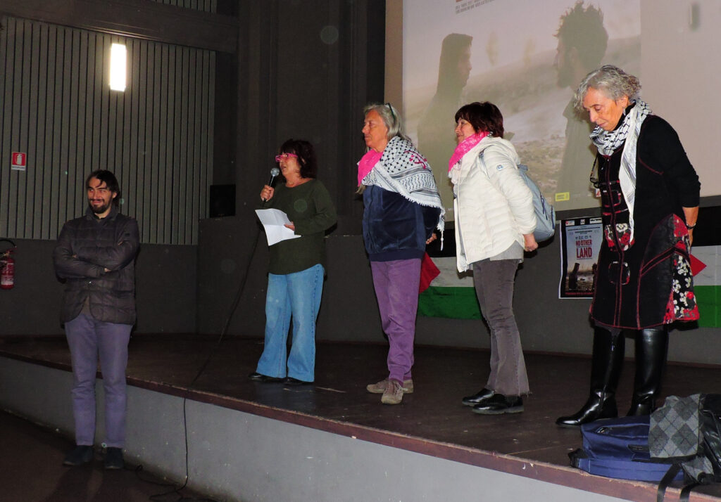 Dopo il saluto del Direttivo del Cineforum portato da Marinella Faedda, Presidente, e Marco Frassinelli, Vice Presidente, le attiviste Susanna Bernoldi per AIFO, Ines Barletta e Silvana Vinai per NUDM Ponente Ligure hanno spiegato le motivazioni che hanno portato a scegliere questo film di denuncia della sistematica violazione dei diritti del popolo palestinese.
