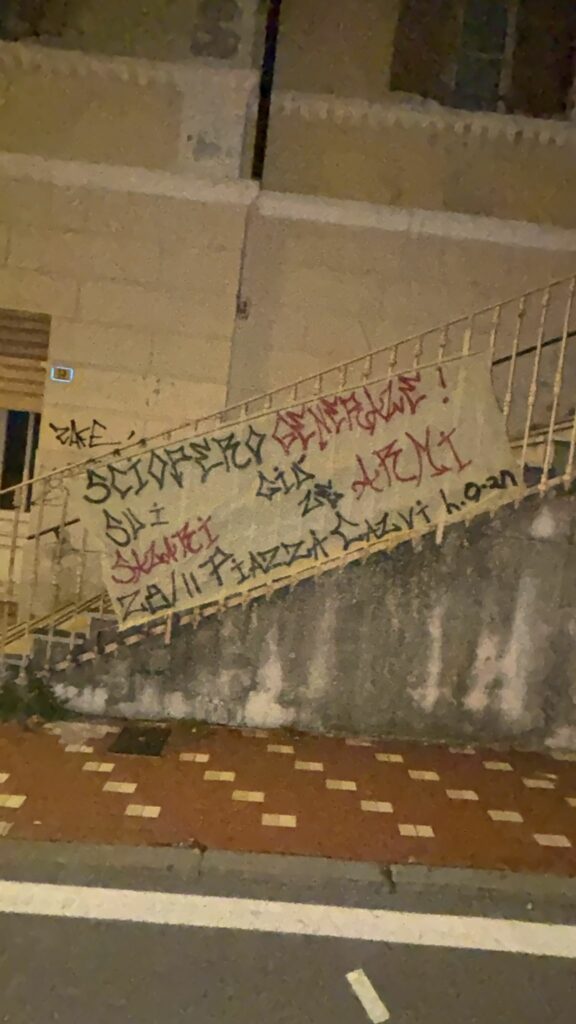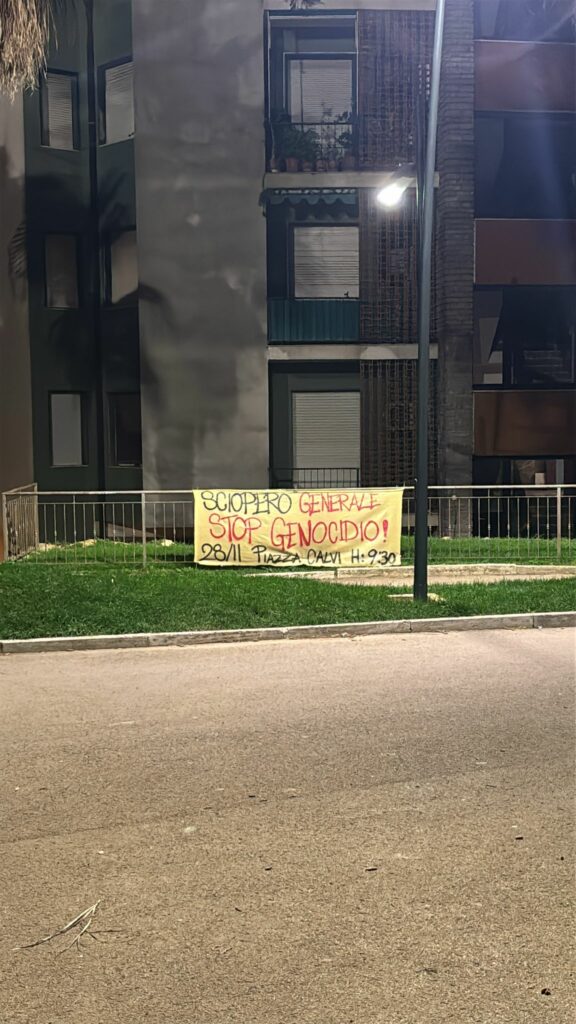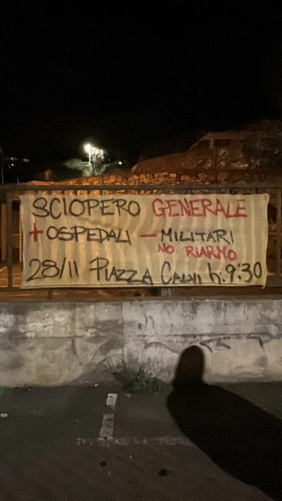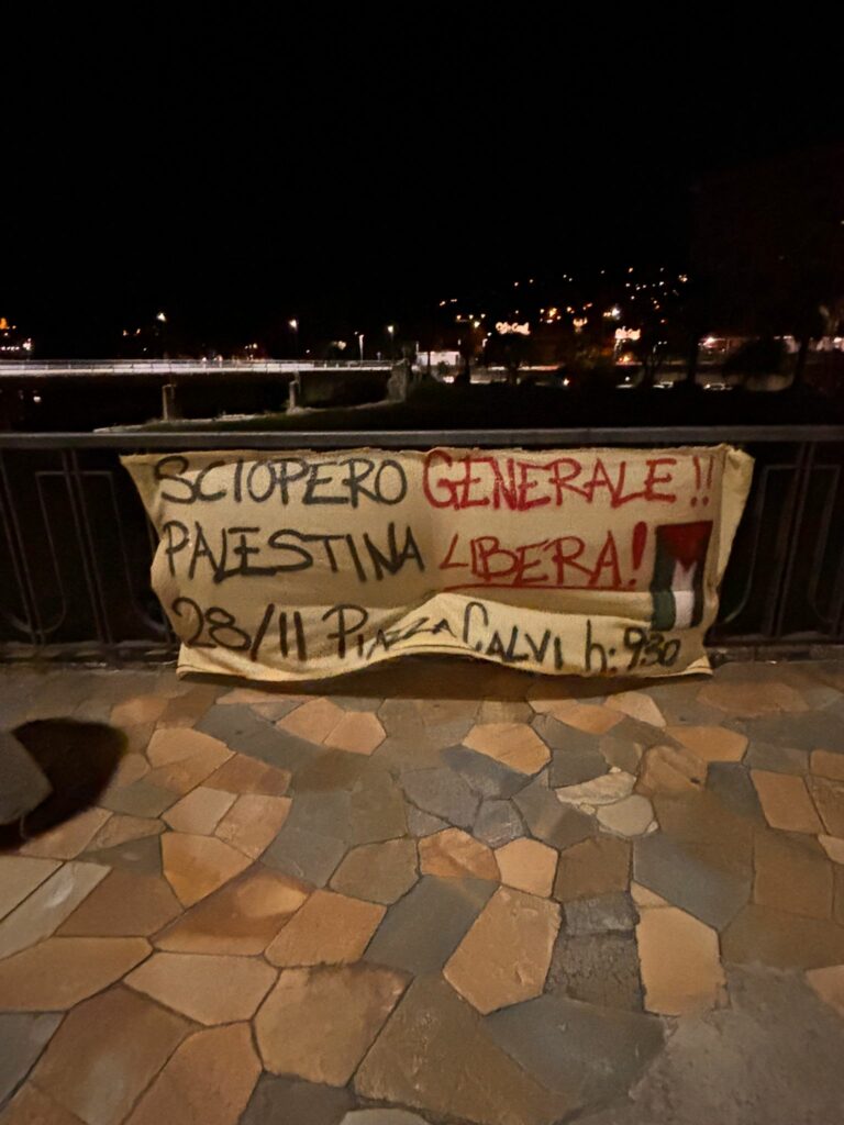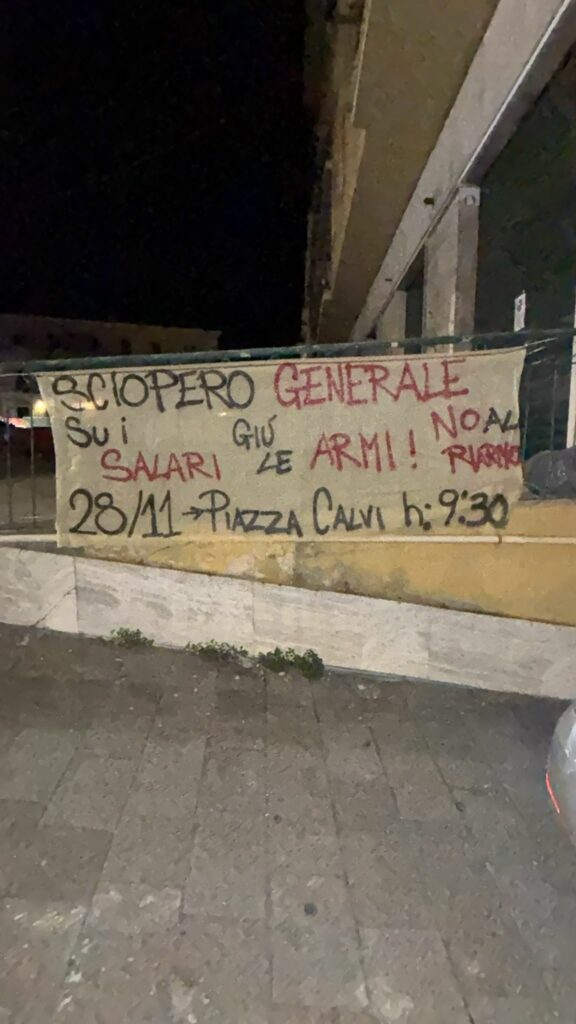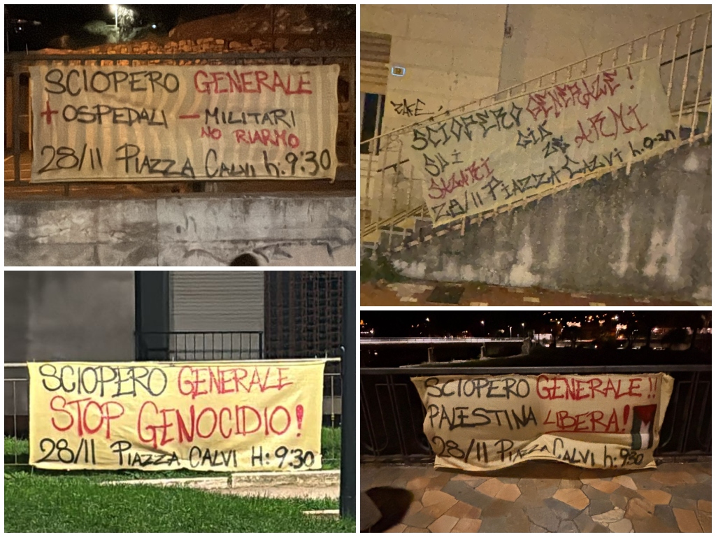Striscioni sono comparsi nella notte in diversi punti strategici della città per invitare i cittadini a partecipare allo sciopero generale di venerdì 28 novembre. I manifesti richiamano l’appuntamento indetto dalla USB per le 9.30 in piazza Ulisse Calvi.