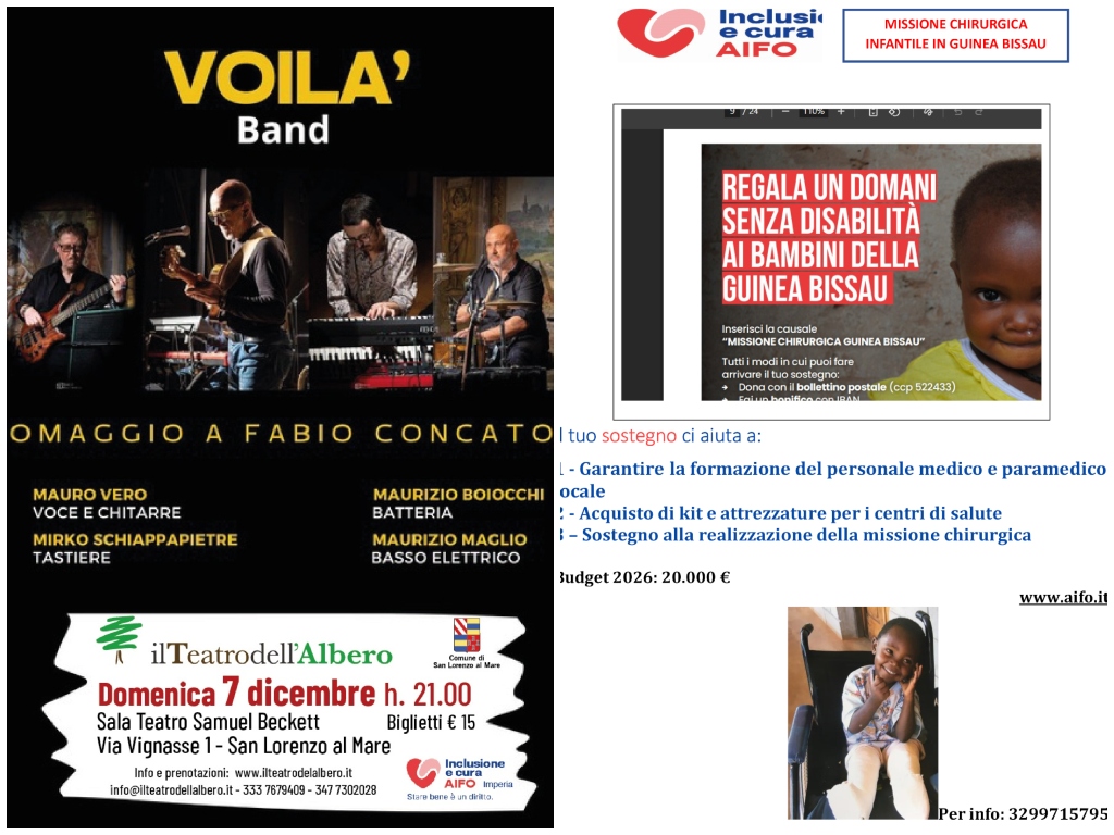 AIFO Imperia è lieta di invitare allo spettacolo “Omaggio a Fabio Concato” che la VOILA’ Band, diretta dal noto chitarrista, cantante, compositore ed arrangiatore Mauro Vero presenterà domenica 7 dicembre alla Sala Teatro Samuel Beckett della Compagnia del Teatro dell’Albero di San Lorenzo al Mare, un luogo unico, pulsante di vita, perfetta cornice per questo grande evento.