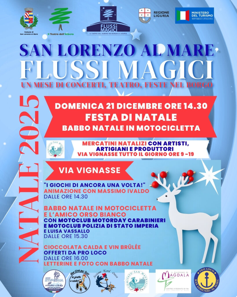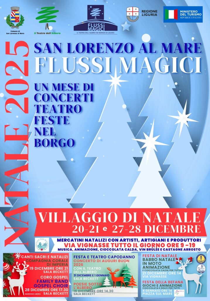“Flussi Magici – Natale 2025” è un invito a vivere l’atmosfera natalizia riscoprendo il piacere di stare insieme, tra cultura, spettacolo e le tradizioni più sentite. Un’occasione unica per i residenti e i visitatori per immergersi nella magia del Natale.Direzione artistica de Il Teatro dell’Albero, con il contributo ottenuto dal Comune di San Lorenzo al mare, a valere sul FUNT di Regione Liguria e Ministero del Turismo.