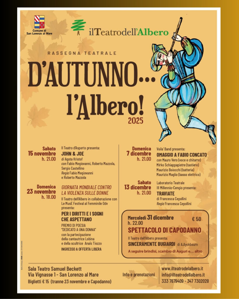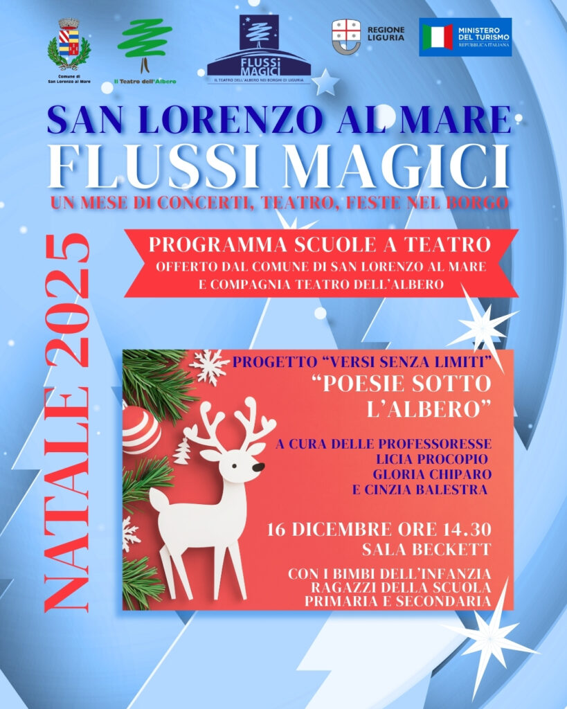 Il Comune di San Lorenzo al Mare, in collaborazione con Il Teatro dell’Albero e la Proloco San Lorenzo al Mare, presenta “Flussi Magici – Natale 2025“, un ricco calendario di eventi che trasformerà il borgo in un luogo incantato, con un mese intero dedicato a spettacoli, musica e tradizione, fino al 5 gennaio 2026.