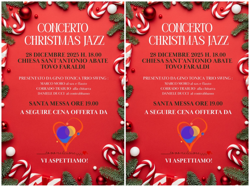 Domenica 28 dicembre, alle ore 18.00, la Chiesa di Sant’Antonio Abate di Tovo Faraldi ospiterà il Concerto “Christmas Jazz”, presentato dal Gino Tonica Trio Swing.