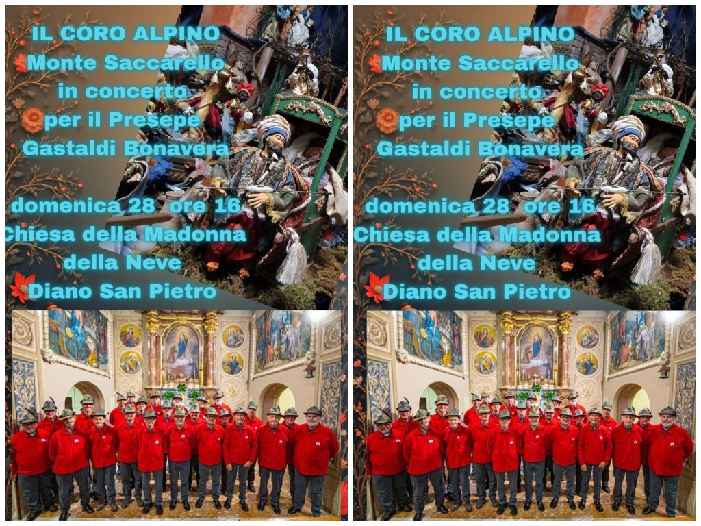 Domenica 28 dicembre alle ore 16 un appuntamento di amicizia, il Coro Alpino Monte Saccarello, che canterà in contemporanea all’apertura del Presepe della Famiglia Gastaldi Bonavera.