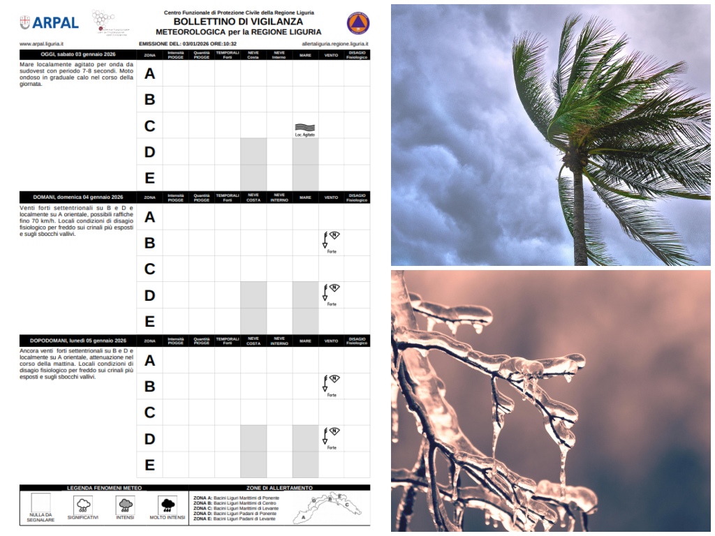 Domani, domenica 4 gennaio, è prevista una nuova intensificazione dei venti settentrionali, con venti forti localmente fino a 70 km/h. ARPAL segnala inoltre condizioni di disagio fisiologico per freddo, in particolare nelle ore mattutine e notturne, soprattutto sui crinali esposti e agli sbocchi vallivi.