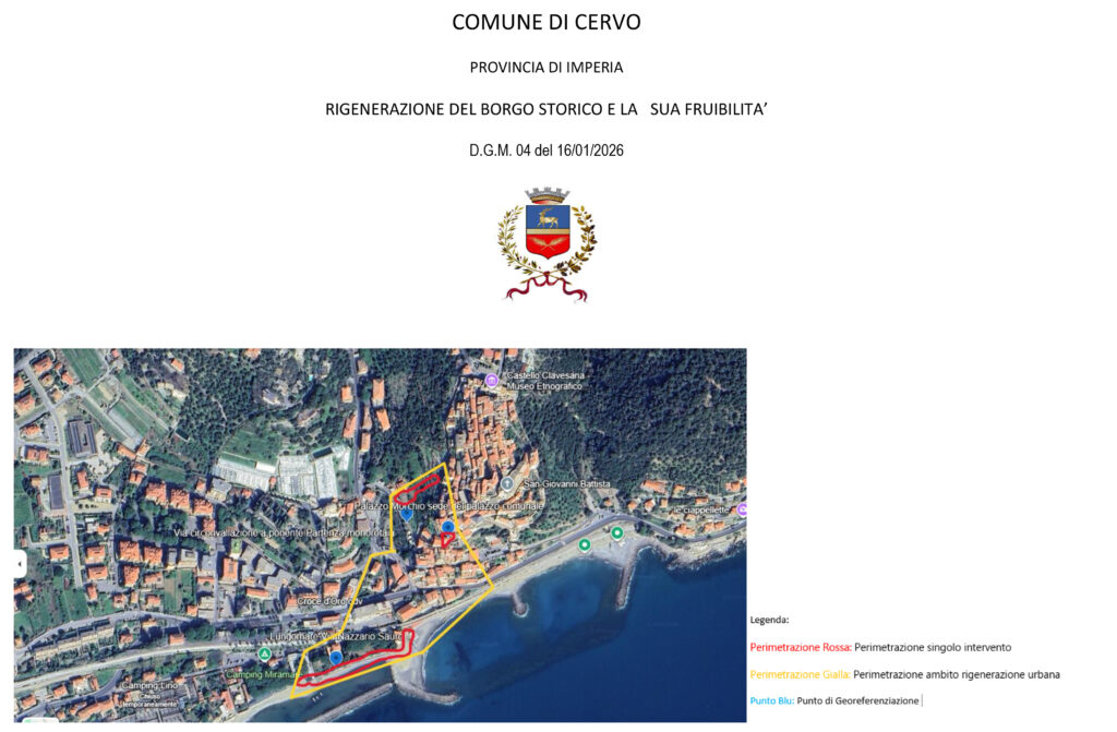 Il Comune di Cervo ha approvato, tramite delibera di Giunta dello scorso 17 gennaio, un ambizioso programma di rigenerazione urbana che prevede la realizzazione di tre importanti progetti finalizzati “al recupero del patrimonio pubblico, al miglioramento dell’accessibilità al