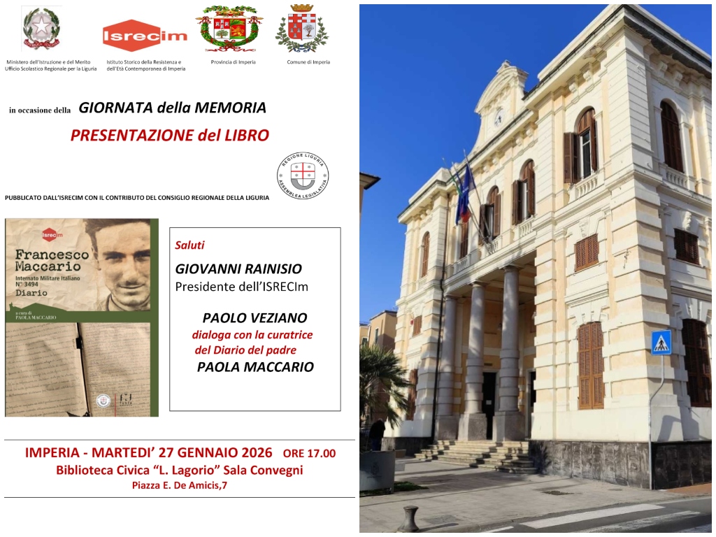 Martedì 27gennaio 2026 ore 17.00 presso la “Sala Convegni” della Biblioteca Civica Leonardo Lagorio di Imperia porterà i saluti Giovanni Rainisio Presidente ISRECIm, Paolo Veziano dialogherà con la curatrice del Diario del padre Paolo Maccario.