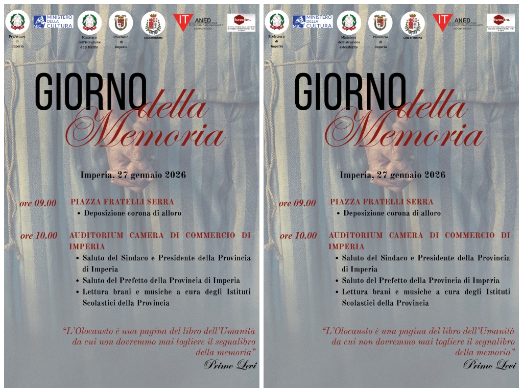 Le iniziative, che si terranno martedì 27 gennaio, alla presenza delle Autorità civili, militari e religiose, sono state organizzate dalla Prefettura in collaborazione con il Comune di Imperia, la Provincia di Imperia, l’Ufficio Scolastico Provinciale, l’Archivio di Stato, le Associazioni ISRECIM (istituto storico della resistenza e dell’età contemporanea) e ANED (Associazione Nazionale Ex Deportati)