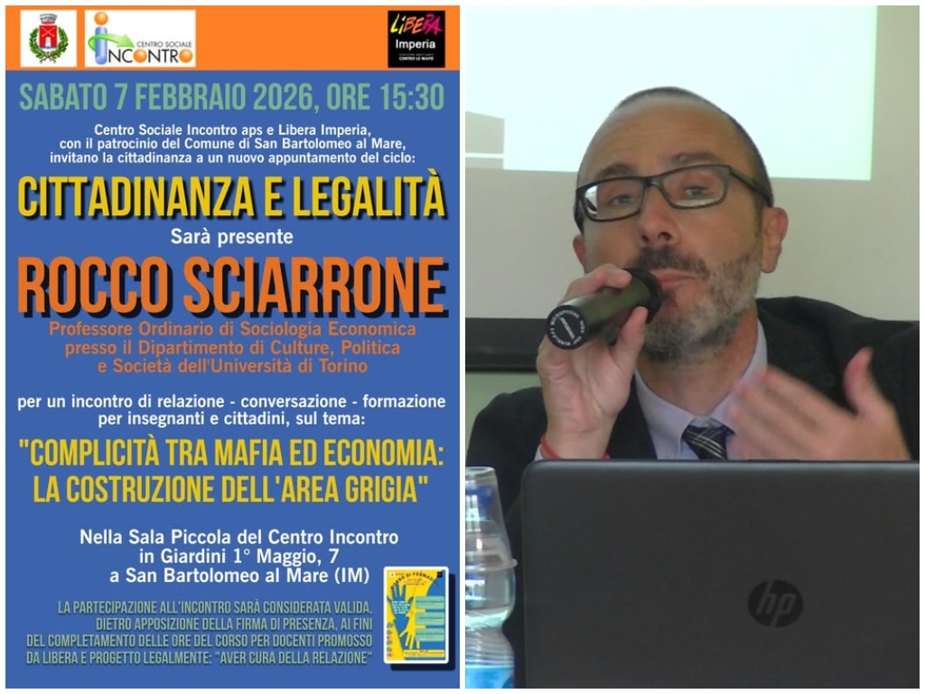 Il Centro Sociale Incontro APS e Libera Imperia, con il patrocinio del Comune di San Bartolomeo al Mare, promuovono un nuovo appuntamento del ciclo “Cittadinanza e Legalità”, inaugurato il 16 dicembre con il Procuratore Capo della Repubblica Alberto Lari.