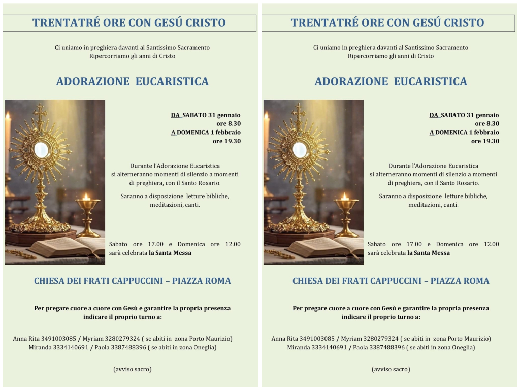 Saranno a disposizione dei fedeli letture bibliche, meditazioni e canti. Chi desidera partecipare e garantire la propria presenza può prenotare il proprio turno contattando Anna Rita (3491003085) o Myriam (3280279324) per chi abita in zona Porto Maurizio, oppure Miranda (3334140691) o Paola (3387488396) per chi abita in zona Oneglia.