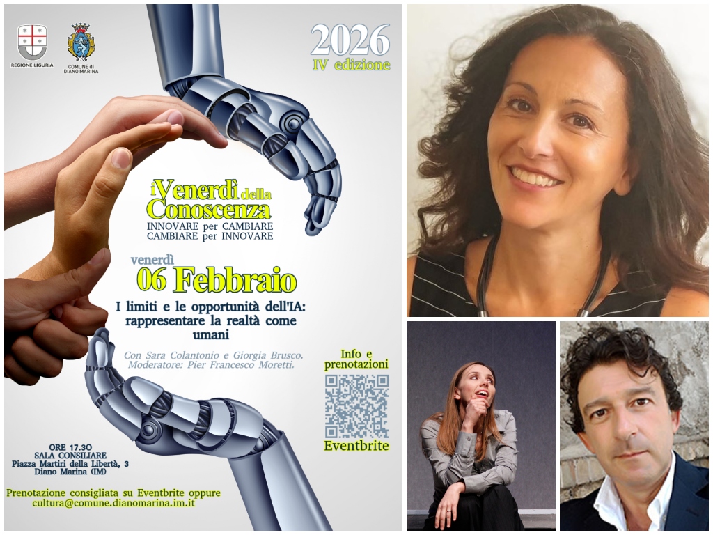 L’incontro di venerdì 6 febbraio si preannuncia come un momento di profonda analisi, in cui la scienza e l’arte si incontreranno per definire i contorni di un futuro sempre più plasmato dall’Intelligenza Artificiale, ma che non può prescindere dalla dimensione umana. Gli incontri si possono seguire anche in streaming https://dianomarina.consiglicloud.it/home mentre all’indirizzo https://dianomarina.consiglicloud.it/archive si trova l’archivio delle registrazioni della conferenze. È possibile confermare la propria presenza tramite e-mail a cultura@comune.dianomarina.im.it o su Eventbrite https://www.eventbrite.com/cc/i-venerdi-della-conoscenza-2026-4799752 .