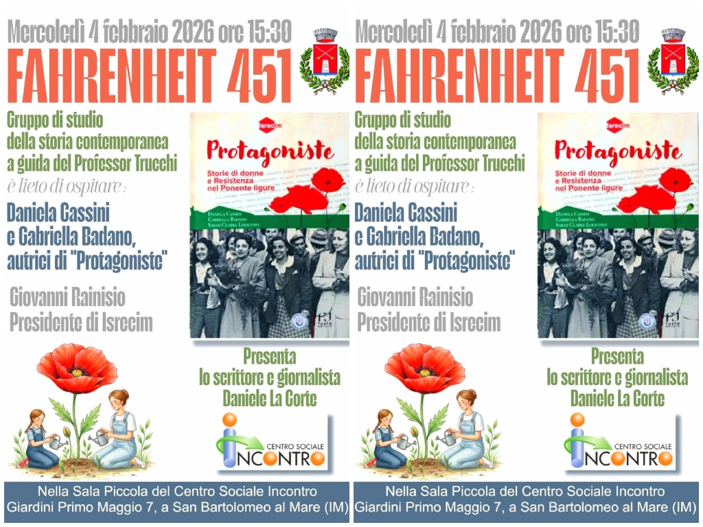 Mercoledì 4 febbraio, a partire dalle ore 15:30, a conclusione del ciclo “Fahrenheit 451”, il gruppo di studio della storia contemporanea guidato dal professor Edoardo Trucchi, ospiterà Daniela Cassini e Gabriella Badano, autrici, con Sarah Clarke Loiacono, del libro “Protagoniste”, edito da Fusta per Isrecim, l’Istituto Storico della Resistenza e dell’Età Contemporanea di Imperia.