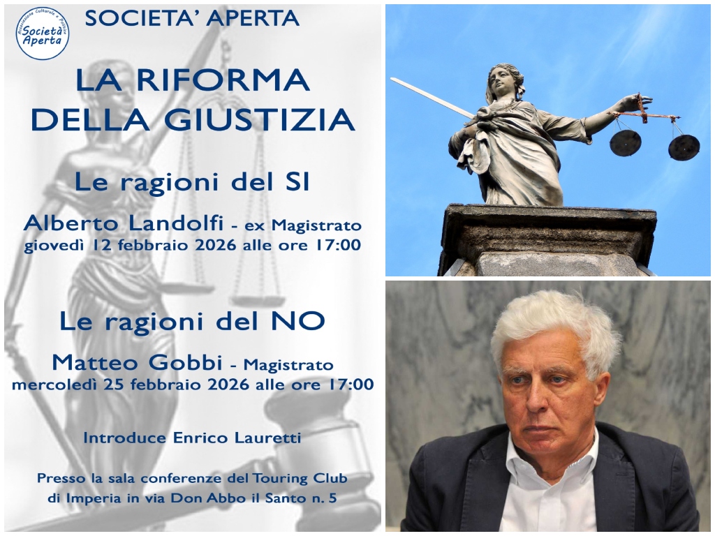Doppio appuntamento dedicato al Referendum sulla Giustizia presso la sala conferenze del Touring Club di Imperia in via don Abbo il Santo n°5. Società Aperta, lista civica guidata in consiglio comunale dal consigliere Enrico Lauretti, propone due incontri dedicati rispettivamente alle ragioni del “Sì” e a quelle del “No” al referendum costituzionale che si terrà il 22 e 23 marzo prossimi.