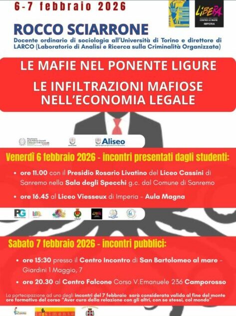 Venerdì 6 febbraio alle 16.45, nell’Aula Magna del Liceo Vieusseux di Imperia, si terrà un incontro–dibattito con il Professor Rocco Sciarrone, sociologo dell’Università di Torino, direttore di LARCO e autore di Prima lezione di sociologia delle mafie (Laterza).