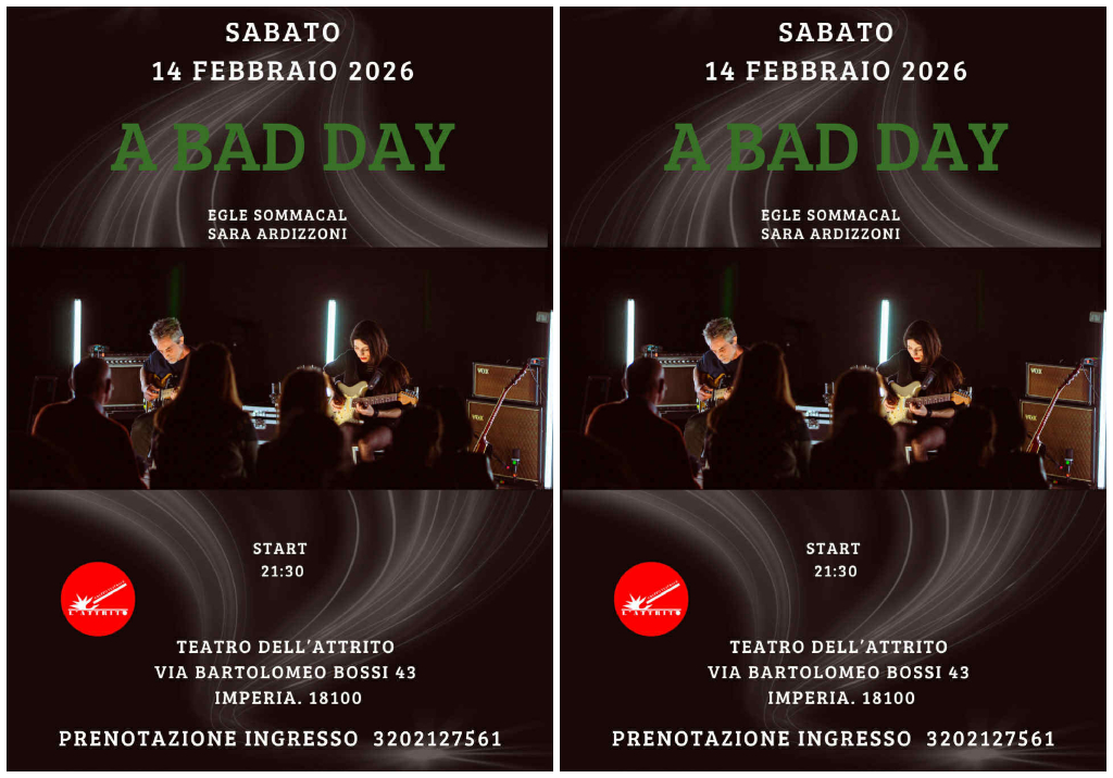 Sabato 14 febbraio, alle ore 21.30, appuntamento al Teatro dell’Attrito di Imperia, in via Bartolomeo Bossi. “A Bad Day” è un progetto di musica strumentale che coinvolge Egle Sommacal e Sara Ardizzoni, chitarristi con esperienze significative alle spalle, tra cui Massimo Volume, Premio Ciampi alla carriera 2024.
