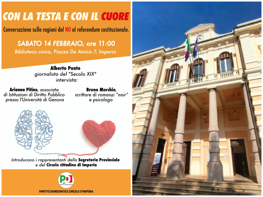 Sabato 14 febbraio 2026 alle ore 11 presso la biblioteca civica di Imperia Oneglia il Partito Democratico di Imperia organizza un incontro pubblico sulle ragioni del NO al referendum costituzionale dal titolo evocativo “Con la testa e con il cuore“.