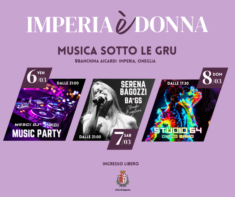In occasione della Festa della donna, il Comune propone un fine settimana, con ingresso libero, all’insegna della musica e della condivisione con “Imperia è Donna – Musica sotto le Gru”, serie di appuntamenti in programma presso la suggestiva Banchina Aicardi, a Imperia Oneglia.