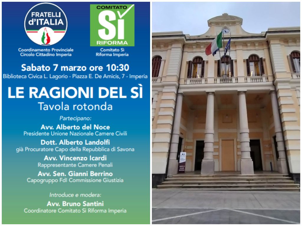 Sabato 7 marzo alle ore 10.30, presso la Biblioteca Civica “L. Lagorio” di Imperia, si terrà la tavola rotonda dal titolo “Le Ragioni del Sì”, promossa dal Coordinamento Provinciale e dal Circolo Cittadino di Fratelli d’Italia Imperia, in collaborazione con il Comitato Sì Riforma Imperia.