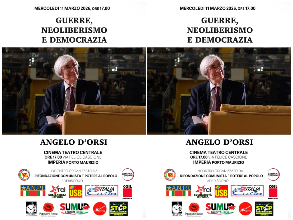 Mercoledì 11 marzo alle ore 17 presso il cinema Centrale a Imperia Porto Maurizio il professor Angelo D’Orsi terrà una conferenza dal titolo “Guerre, neoliberismo e democrazia“, organizzata dalla Federazione di Imperia del Partito della Rifondazione Comunista e Potere al Popolo. L’ingresso è gratuito.