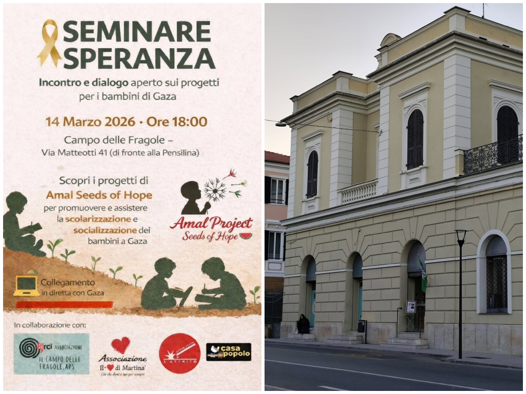 Sabato 14 marzo 2026 alle ore 18.00, presso ARCI ‘Il Campo delle Fragole’ (Via Matteotti 41, di fronte alla pensilina), si terrà “Seminare Speranza”, un incontro pubblico dedicato alla presentazione dei progetti di Amal Seeds of Hope a sostegno della scolarizzazione e della socializzazione dei bambini a Gaza.
