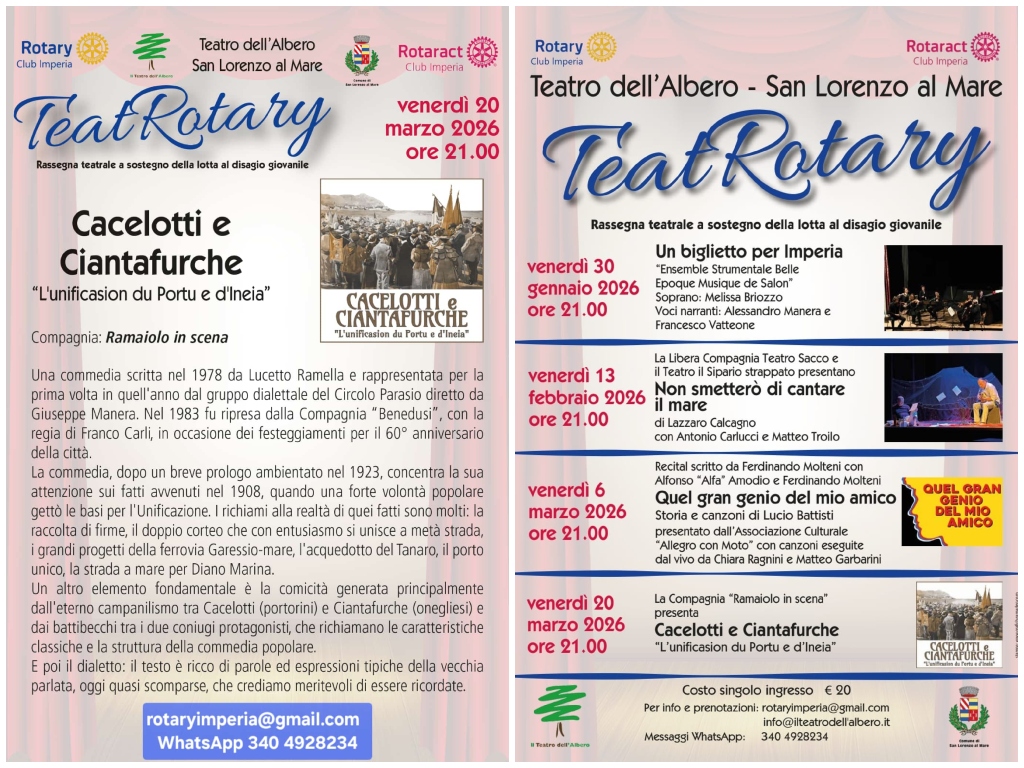 Venerdì 20 marzo alle ore 21, nell’ambito della rassegna teatrale “TeatRotary” (organizzata dal Rotary Club Imperia e dal Rotaract Club Imperia), la compagnia il “Ramaiolo in scena” porterà sul palco del Teatro dell’Albero di San Lorenzo al Mare lo spettacolo “Cacelotti e Ciantafurche – L’unificasion du Portu e d’Ineia“.