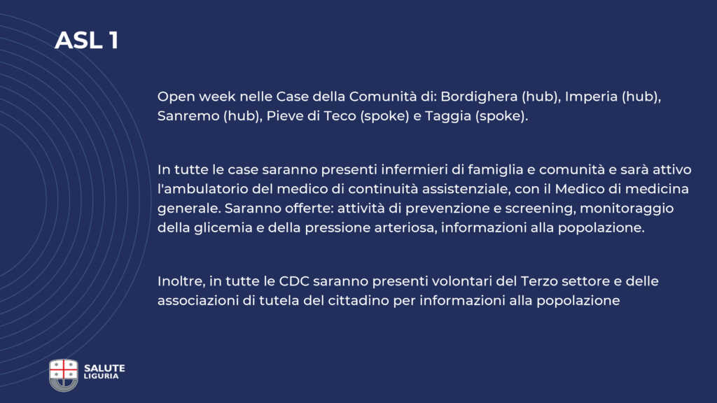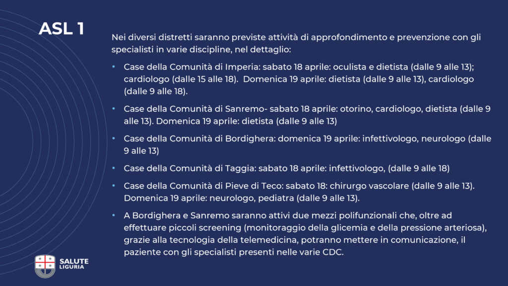 Un week-end dedicato alla salute di prossimità e alla conoscenza dei servizi sanitari territoriali a disposizione dei cittadini: sabato 18 e domenica 19 aprile tutte le Case della Comunità della Liguria, oltre alla consueta presenza nei fine settimana dei medici di medicina generale, offriranno visite e varie prestazioni, gratuite, ad accesso diretto. Un modo per diffondere maggiormente la conoscenza e l’abitudine a servirsi di queste strutture sempre più centrali nel Servizio sanitario regionale.
