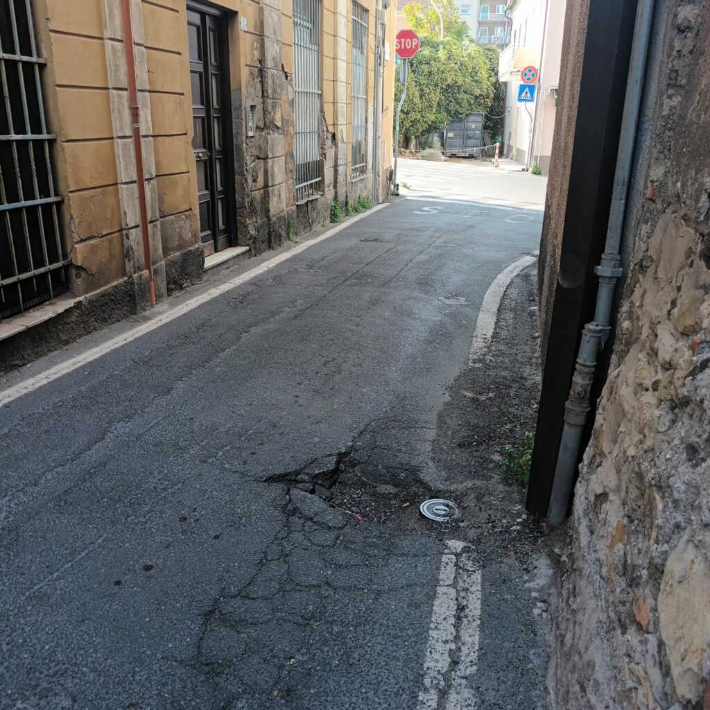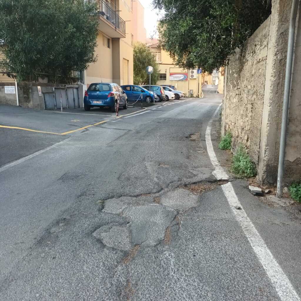 La Bozzano, a seguito della segnalazione dei residenti, denuncia “nei pressi del civico 6 una buca con conseguente cedimento dell’asfalto, potenzialmente pericolosa e profonda”. Ulteriori criticità poco più avanti: “altre buche ed avvallamenti vicino a un dosso artificiale e allo specchio parabolico di fronte al cancello di servizio del Tribunale di Imperia”.