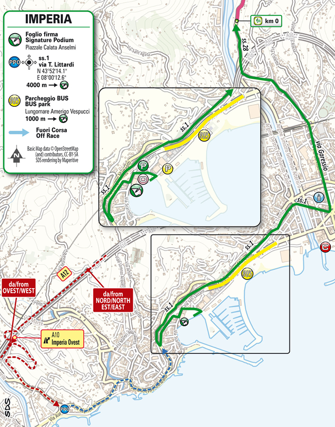 Il percorso vedrà gli atleti immettersi in via Scarincio per poi proseguire in via Pirinoli. I partecipanti svolteranno quindi a destra sull’Aurelia, passeranno davanti alla pensilina di Porto Maurizio e proseguiranno in via Siffredi, via Battaglione alpini Pieve di Teco e percorreranno l’Aurelia fino a Piazza Dante (passando davanti al Comune). Da lì svolteranno a sinistra attraverso Largo Nanollo Piana e successivamente in via Berio e via Garessio. La gara quindi passerà per la rotonda dell’autostrada per poi proseguire per via Nazionale in direzione Pieve di Teco. La competizione vedrà gli atleti proseguire successivamente in direzione Albenga per poi dirigersi verso Savona e quindi proseguire fino a Novi Ligure, dove è previsto l’arrivo per le 17,26.