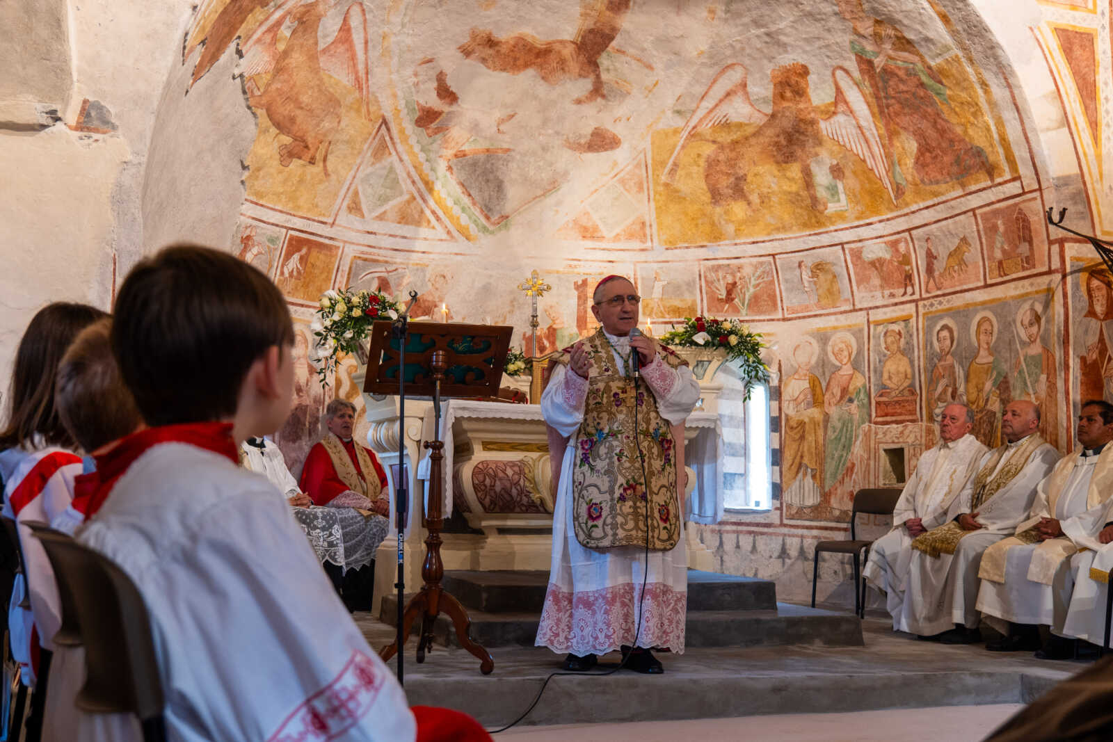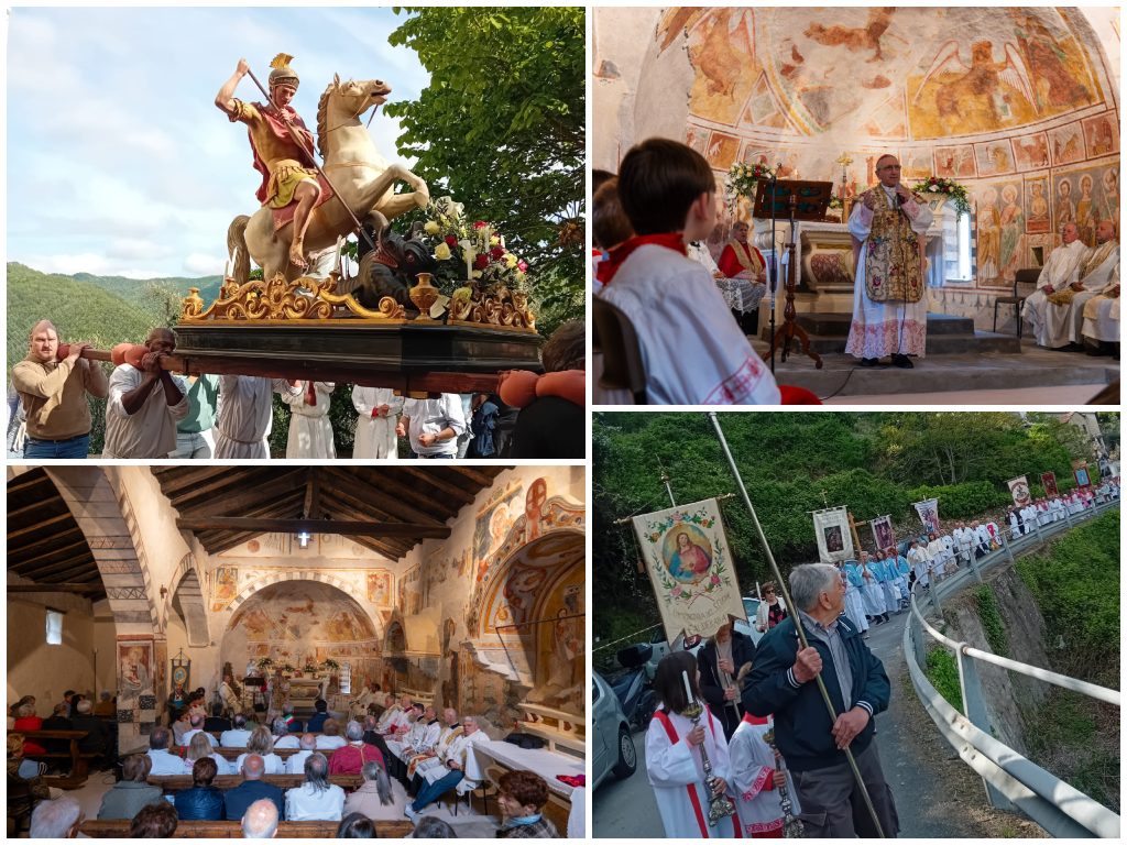 Lo scorso 26 aprile, una soleggiata domenica di primavera, il Vescovo diocesano, mons. Guglielmo Borghetti, ha celebrato solennemente la S. Messa nell’antica chiesa di San Giorgio Vecchio, situata accanto al cimitero del borgo di Calderara, frazione di Pieve di Teco, in Valle Arroscia.