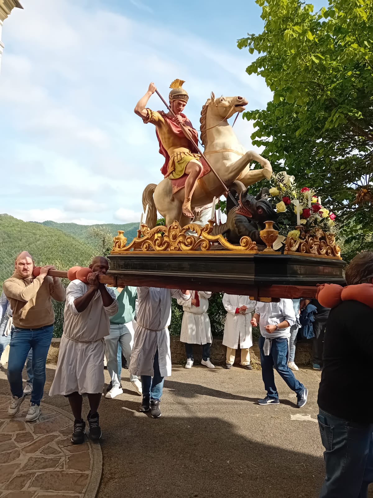 L’occasione è stata la festa patronale di San Giorgio martire, al quale la popolazione locale è particolarmente devota. La presenza di diversi sacerdoti, di autorità civili e militari, di numerose confraternite, alcune delle quali portavano i loro monumentali crocifissi, ha reso la celebrazione della Messa e la successiva processione ancora più solenni.