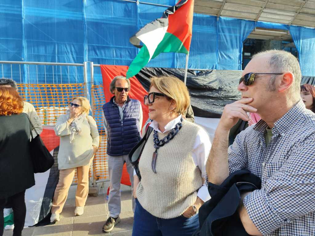 “La ragione di questo presidio ovviamente è l’attacco che c’è stato la notte scorsa alla Global Sumud Flotilla – spiega Roberto Raineri –, un attacco che è avvenuto proprio al di fuori di qualsiasi linea rossa, nel senso che è avvenuto in mare aperto a più di 900 miglia dalle coste di Gaza, a sud della Grecia, una cosa che non si era mai vista, è proprio un atto di pirateria internazionale. Però la cosa fondamentale da ribadire è di non focalizzarsi soltanto su questa cosa qua, che comunque è molto significativa, un attacco al diritto internazionale molto forte, ma è fondamentale mantenere il focus su quello che succede in Medio Oriente. A Gaza, dove nonostante una finta tregua continuano le uccisioni, i massacri continuamente. Quello che succede in Cisgiordania, dove i coloni hanno questo atteggiamento aggressivo e omicida. E tutto il resto del Medio Oriente, l’Iran, il Libano: è una polveriera dove esiste un unico responsabile, che è Israele”.