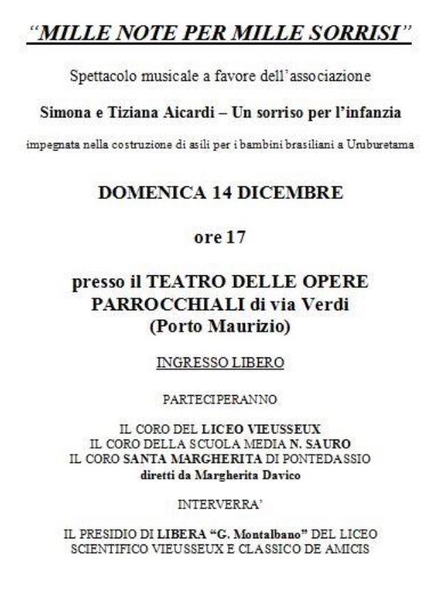 Imperia. Domani, domenica 14 dicembre, presso il teatro delle opere parrocchiali di Via Verdi, Porto Maurizio, alle 17 si terrà lo spettacolo musicale “Mille Note per Mille Sorrisi” a favore dell’associazione Simona e Tiziana Aicardi – Un sorriso per l’infanzia.L’ingresso è gratuito e parteciperanno il coro del Liceo Vieusseux, il coro della scuola media N.Sauro, il coro Santa Margherita di Pontedassio, tutti diretti da Margherita Davico. Inoltre interverrà il presidio di Libera “G.Montalbano” del Liceo Scientifico Vieusseux e classico De Amicis.