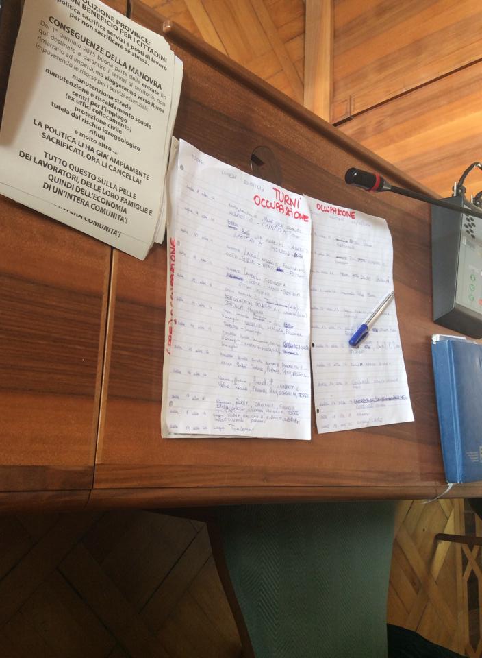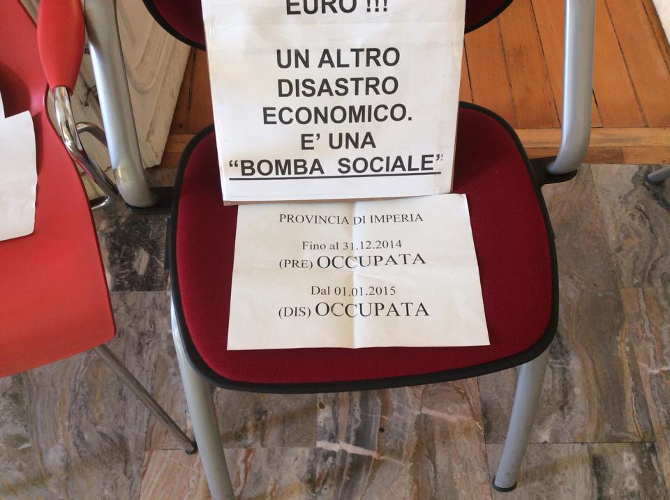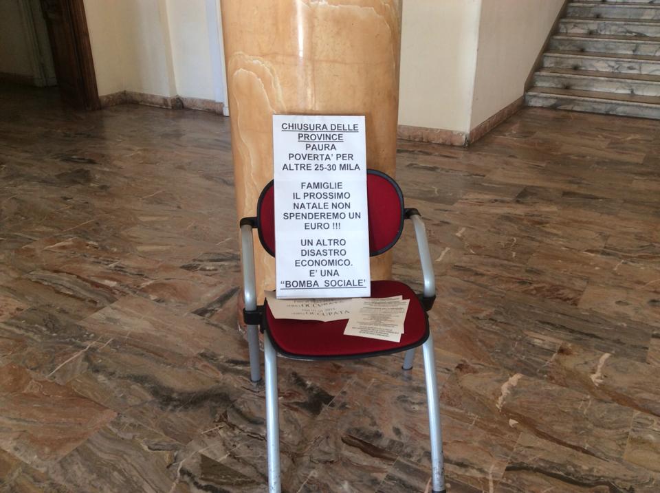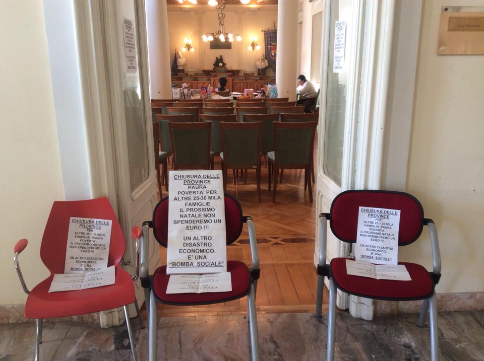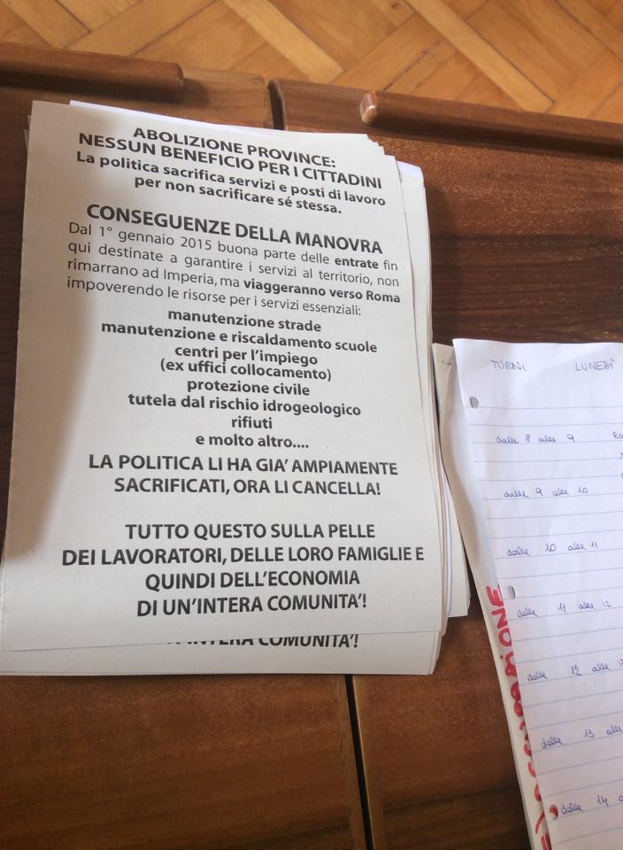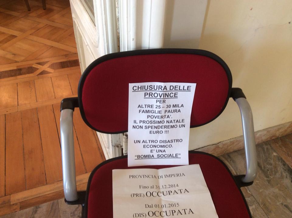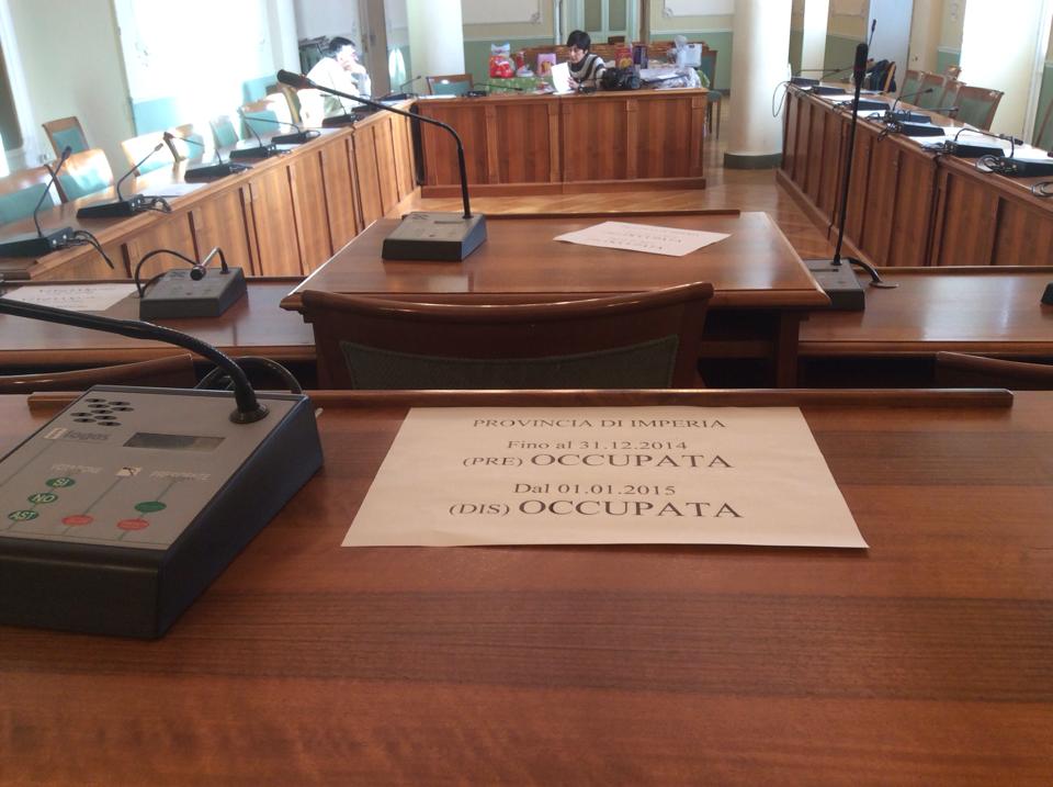 Imperia – Prosegue senza sosta l’occupazione della Provincia di Imperia per protestare contro i tagli alla pubblica amministrazione imposti dal Governo Renzi che rischiano di lasciare a casa il 50% dei dipendenti dell’Ente. L’occupazione proseguirà sino a martedì sera. In totale sono 90, come annunciato dal presidente della Provincia Luigi Sappa, i dipendenti che rischiano seriamente di perdere il posto di lavoro a partire dall’1 gennaio.
