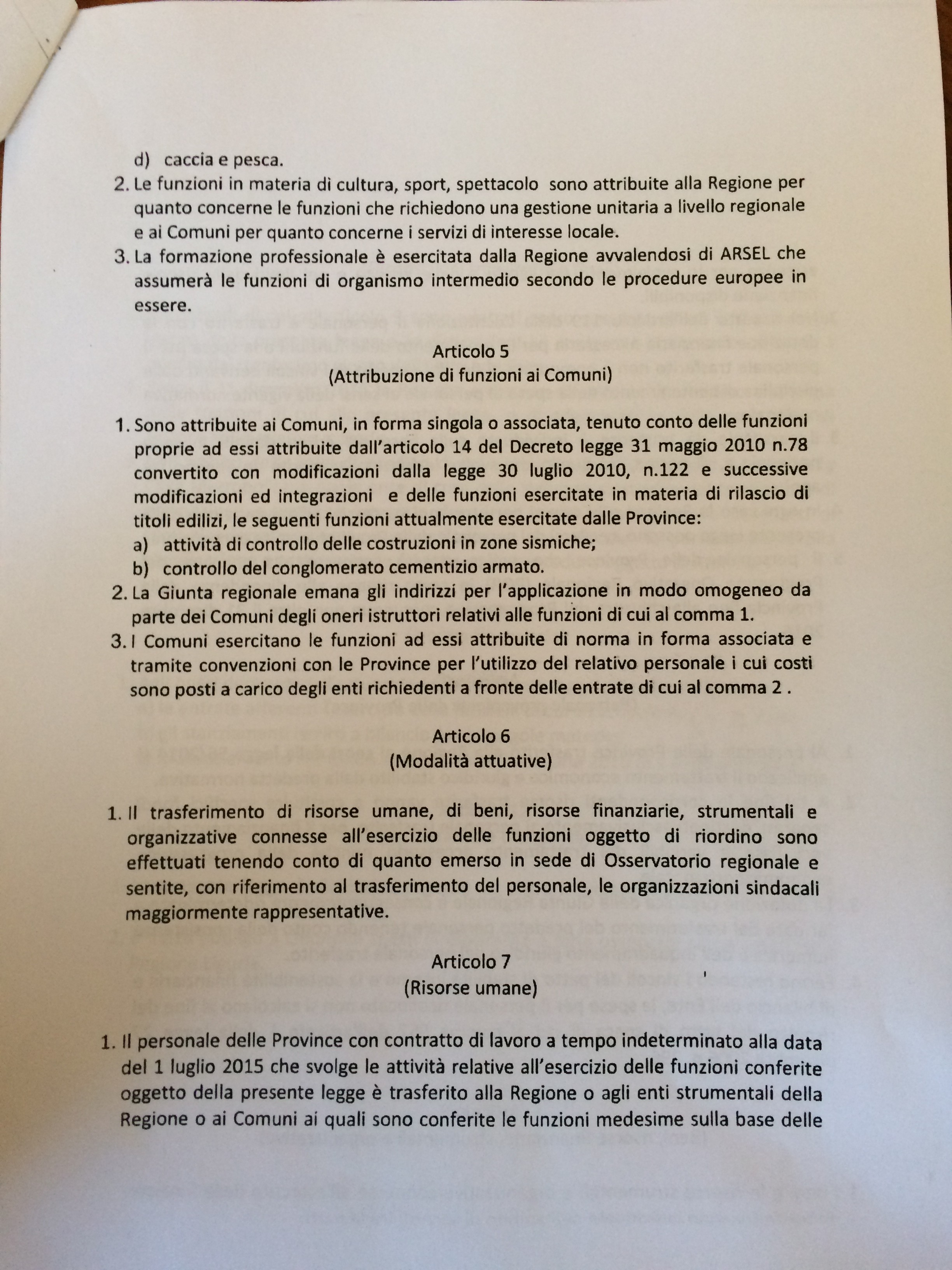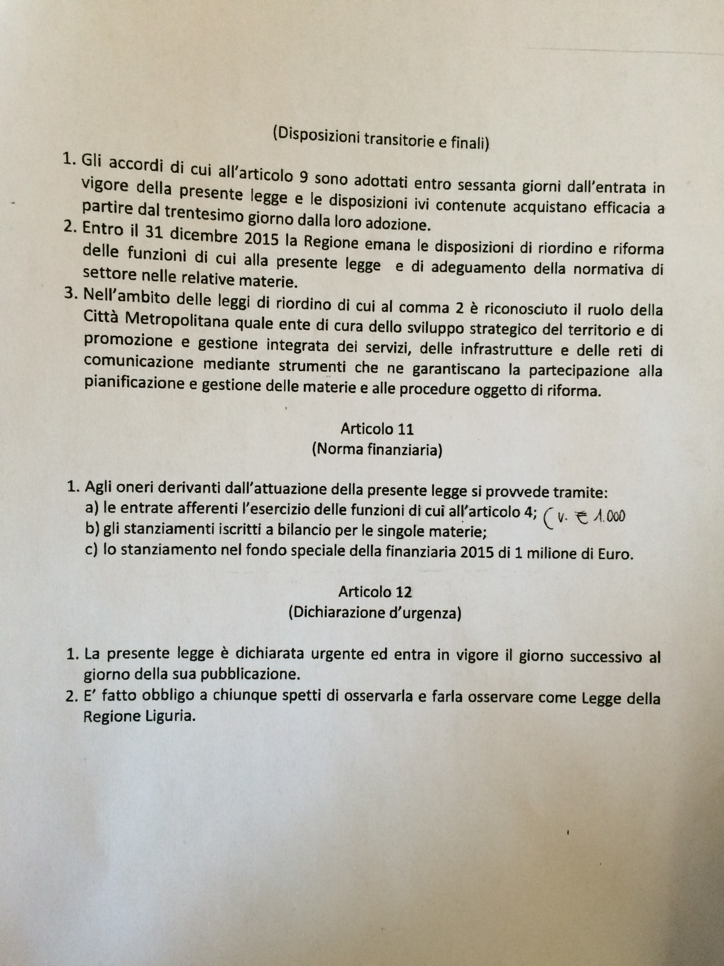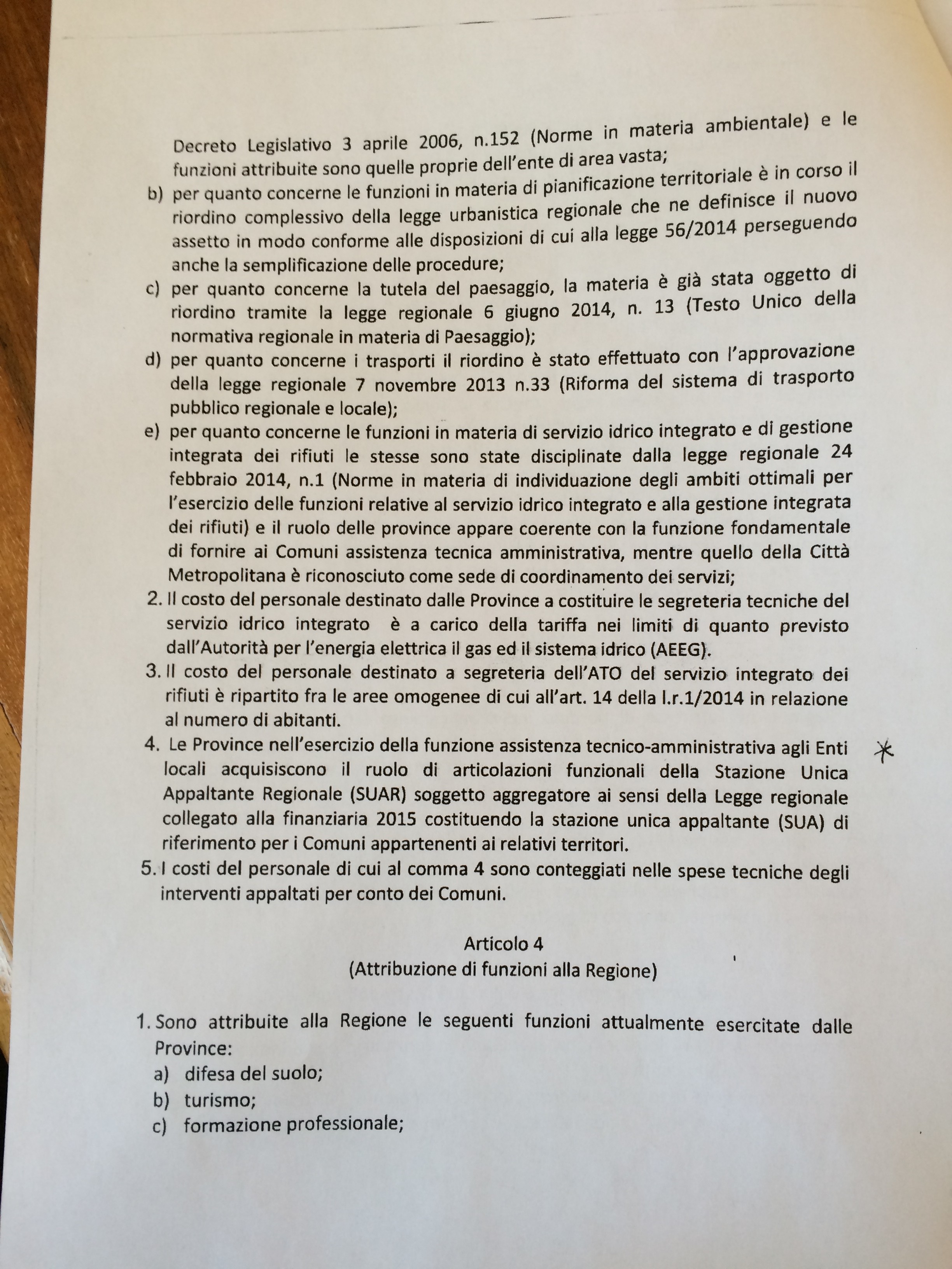 GENOVA. Un disegno di legge che riordina le funzioni e le competenze, fino ad oggi in capo alle Province. E’ stato approvato dalla Giunta regionale su proposta degli assessori regionali alle infrastrutture, con delega al riordino delle competenze e al bilancio, Raffaella Paita e Pippo Rossetti. Sulla base del nuovo ddl che dovrà passare al vaglio del CAL, il consiglio delle autonomie locali e successivamente del consiglio regionale, sono attribuite alla Regione Liguria la difesa del suolo, la formazione professionale, caccia, pesca e turismo. Quest’ultima competenza sarà suddivisa con i Comuni che dovranno occuparsi dei servizi di interesse locale, mentre la Regione si occuperà della gestione unitaria del tema. “Resta in piedi l’Osservatorio tra Regione Liguria, Anci e organizzazioni sindacali – hanno spiegato gli assessori Paita e Rossetti – per commisurare il tema del personale con queste funzioni. L’iter complessivo dovrà essere completato il piu’ rapidamente possibile”. Nel frattempo resta ancora aperto il tema delle risorse. “A livello nazionale – concludono Paita e Rossetti – ci aspettiamo che lo stato chiarisca il nodo dei finanziamenti, fondamentale per fare luce sulla partita del personale”.