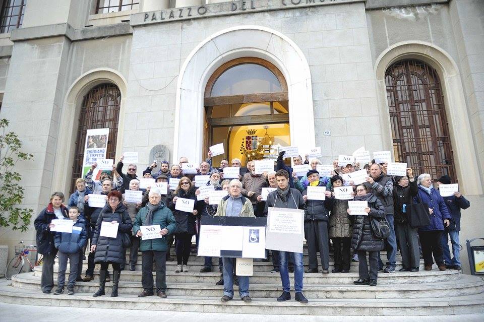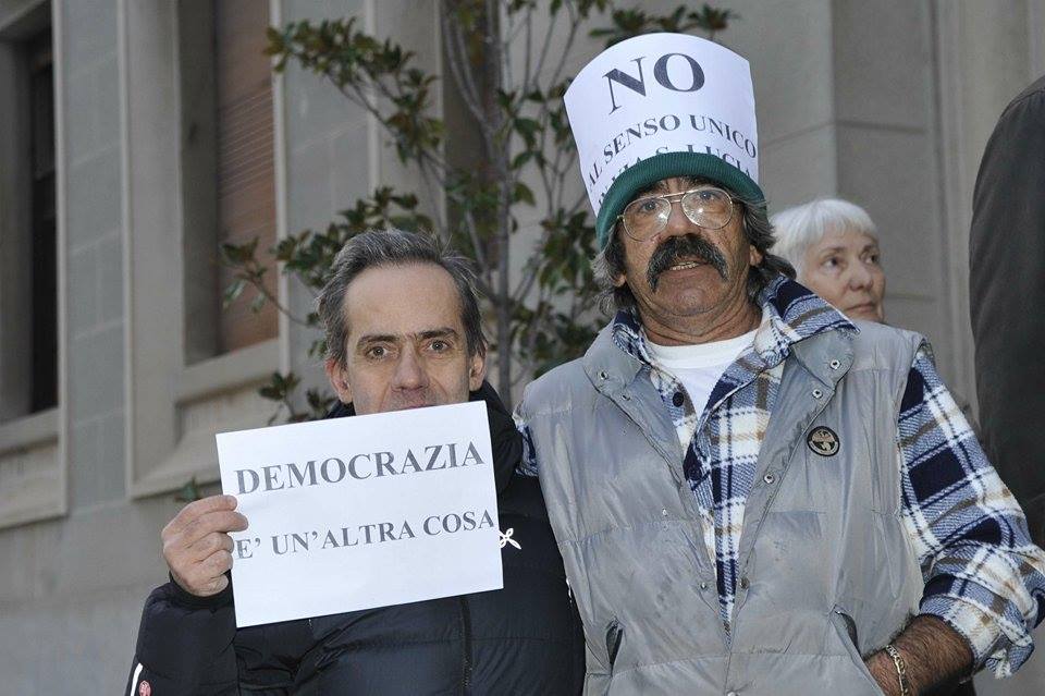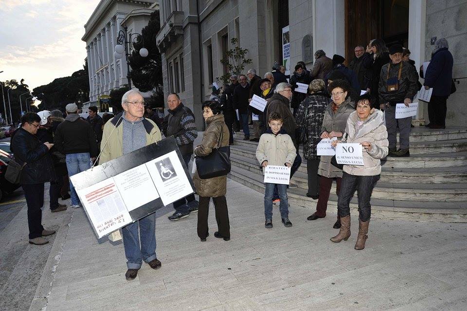 Imperia – Massiccia protesta questo pomeriggio davanti al Comune di Imperia dove una sessantina di residenti hanno presidiato il portone d’ingresso armati di manifesti che chiedono il ripristino del doppio senso di marcia. Nelle scorse settimane l’assessore alla viabilità Giuseppe Zagarella aveva chiuso al dialogo decretando la posizione definitiva del Comune: “Non si torna indietro”. Il comitato però non si è arreso e questo pomeriggio si è presentato in consiglio comunale. Il sindaco Carlo Capacci si è fermato a parlare con i manifestanti senza sbilanciarsi sul futuro.